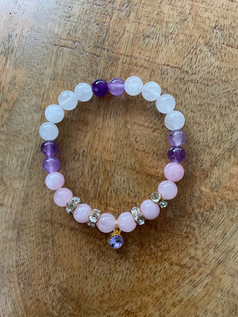 Liefde en rust Rozenkwarts brengt liefde, amethist rust en bergkristal versterkt dit alles.