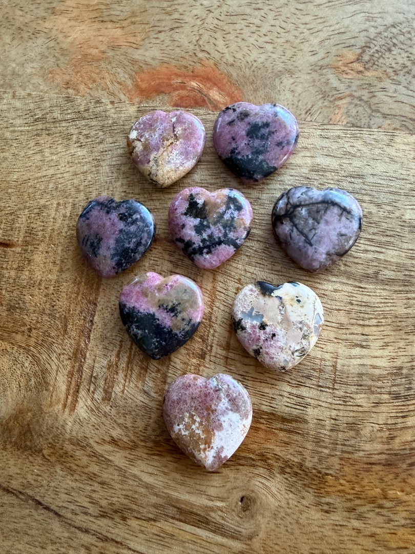 Kleine rhodoniet hartjes zijn mini-hartvormige steentjes van rhodoniet. Ze zijn populair omdat ze makkelijk mee te nemen zijn en vaak een symbolische betekenis hebben.