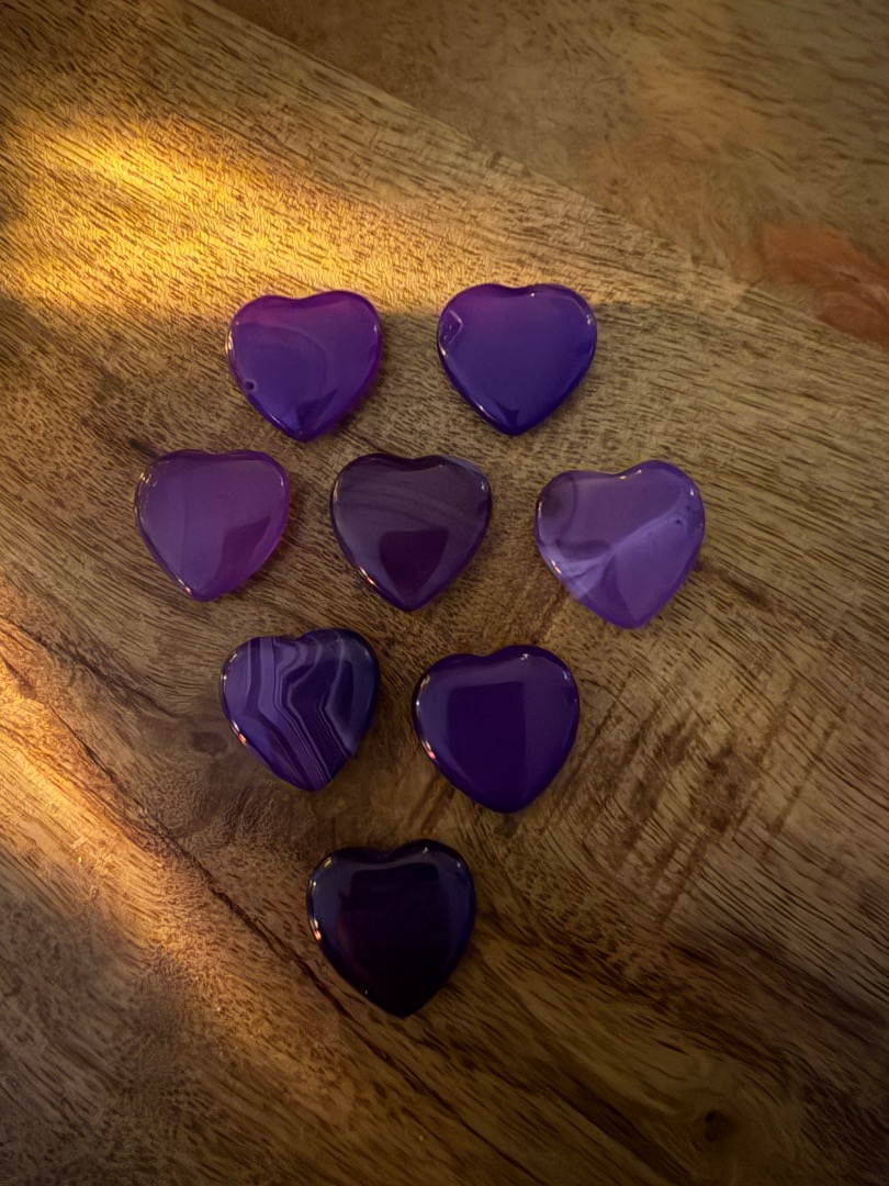 Een paarse agaat hart (klein) is een klein, hartvormig steentje van agaat met lichte en donkerblauwe strepen. Het ziet er rustig en zacht uit en wordt vaak gekozen om zijn symbolische betekenis.