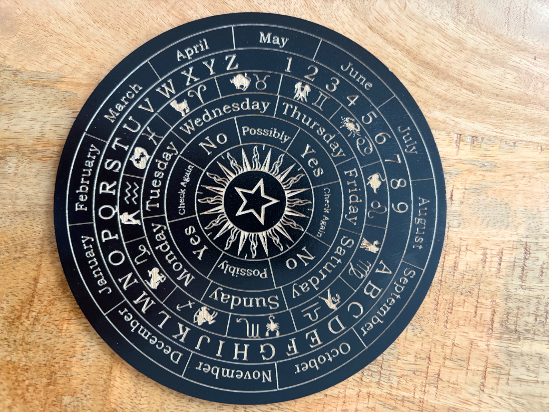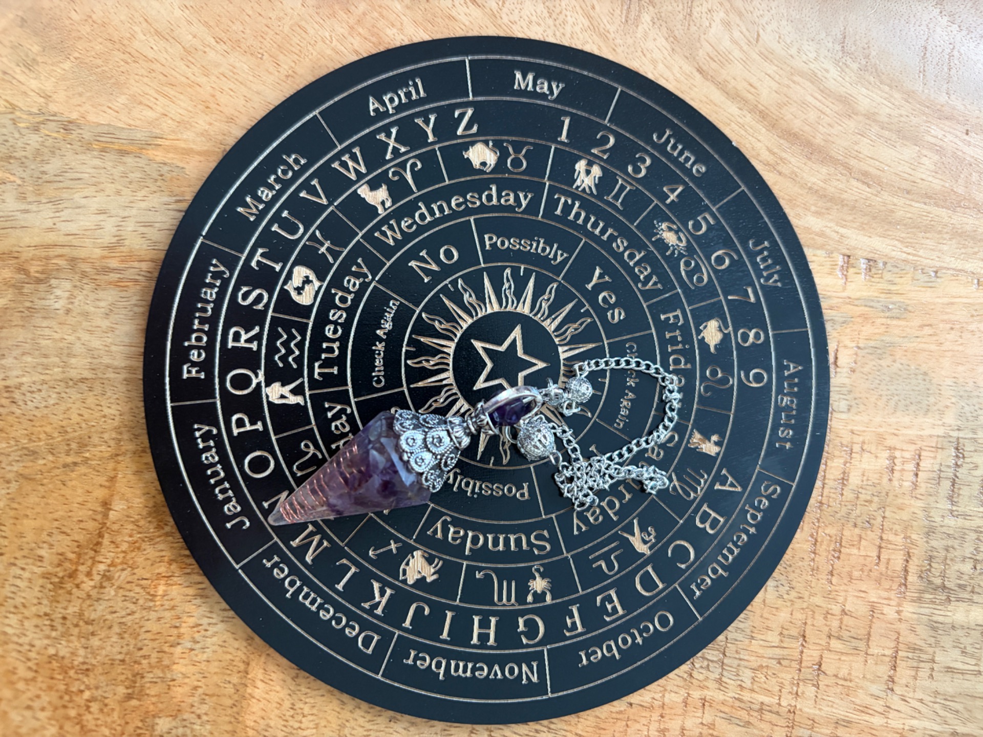 Je houdt de pendel stil boven het midden van het bord en stelt een vraag. Na even wachten begint de pendel te bewegen (bijvoorbeeld heen-en-weer of in een cirkel) en wijst naar: